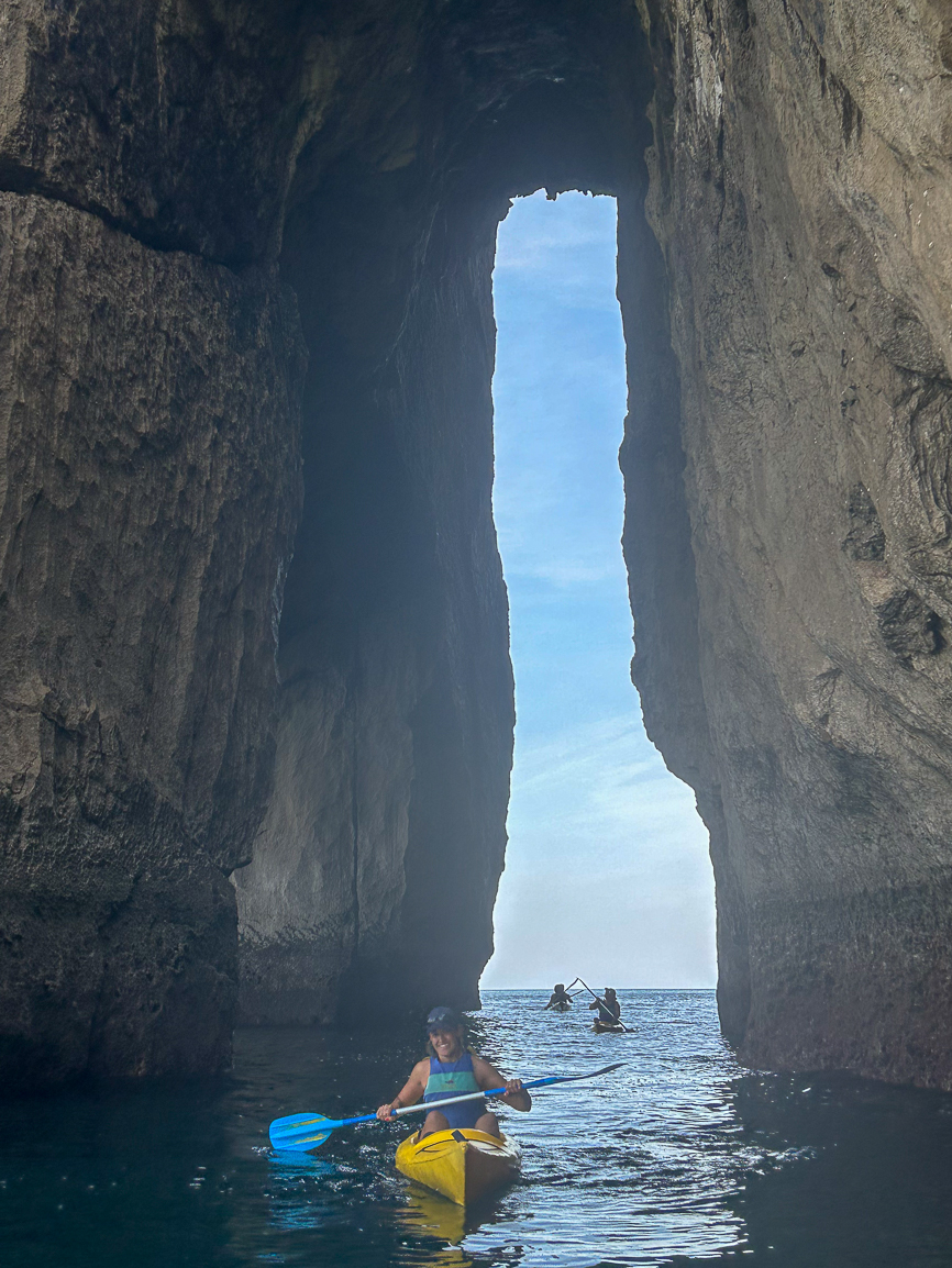After meeting our guides, we quickly boarded a van equipped with a trailer and gear. A 30-minute journey brought us to the starting point of our adventure. Playa de Cuevas del Mar welcomed us with calm waters, sand adorned with rocks, and cliffs full of small caves. Excitedly, we unloaded the kayaks and prepared ourselves: life vests, paddles, and a thirst for adventure!