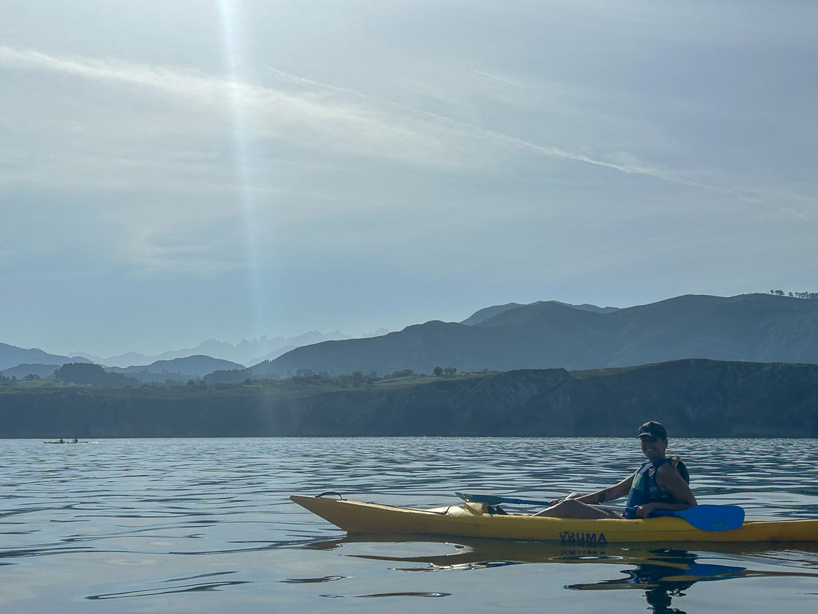 Raggiungiamo la Playa de Guadamía, senza entrarvi. Le nostre guide hanno notato un cambiamento nelle onde, che hanno iniziato a diventare più forti. Decidiamo così di tornare indietro verso la spiaggia di partenza. Ma le sorprese non erano finite: pagaiare un po’ più lontano dalla costa ci ha permesso di ammirare l’incredibile catena montuosa dei Picos de Europa dal mare, in kayak!