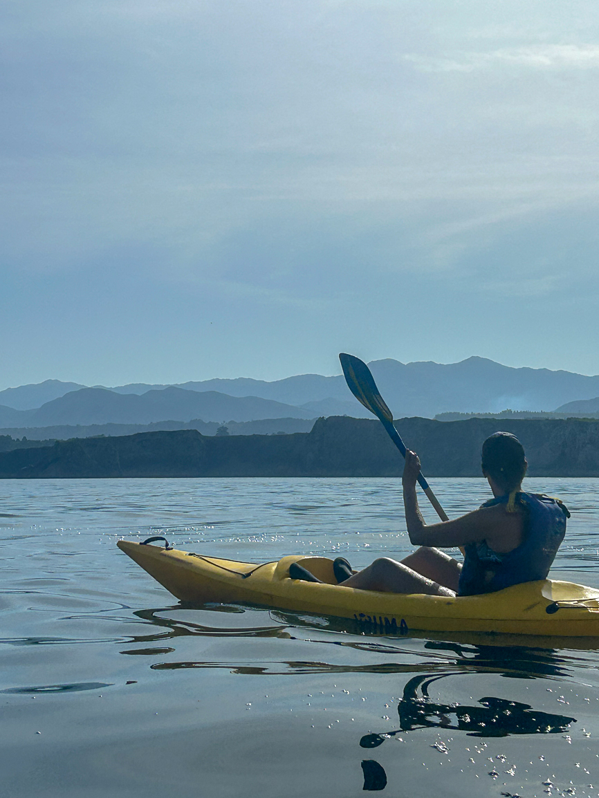 Dopo aver conosciuto le nostre guide, siamo saliti rapidamente sul furgone dotato di rimorchio e attrezzatura. Con circa 30 minuti di tragitto siamo arrivati al punto di partenza dell’escursione. La Playa de Cuevas del Mar ci ha accolti con un mare calmo, sabbia adornata di rocce e scogliere ricche di piccole grotte. Con grande entusiasmo abbiamo scaricato i kayak e ci siamo preparati: giubbotti, pagaie e tanta voglia di avventura!